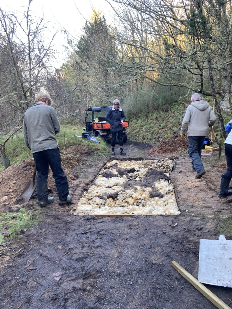 The logic behind all of this is to remove the build-up of mud. The wool fills in the area and then the woodchip is placed on top to stop the wool from blowing away, and create a nice even path. The wool shouldn’t rot as quickly as the woodchip, and it creates a soft terrain underfoot / tyre. The woodchip is now no longer in contact with the soil so it shouldn’t rot either.