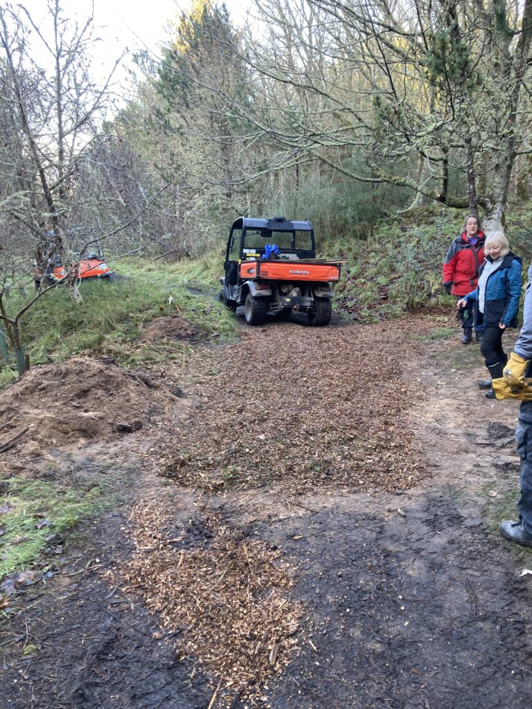 At Dunnet Forest, it is a continuous battle to keep the paths walkable, especially in such a wet place. Paths get very muddy and we can’t just put gravel down on everywhere due to the quantity needed and the costs – so we use our own woodchip as we have a constant supply of it at the forest. However, this does have a knock on effect – the woodchip rots down into the mud and produces more mud for us to cover, it just never ends!